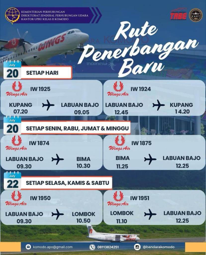 Selain itu, setiap Senin, Rabu, Jumat, dan Minggu, dibuka rute Labuan Bajo – Bima – Labuan Bajo dengan jadwal berangkat pukul 09.30 WITA dan kembali pukul 11.25 WITA. Mulai 22 Juli 2025, rute Labuan Bajo – Lombok – Labuan Bajo juga tersedia setiap Selasa, Kamis, dan Sabtu dengan jadwal berangkat pukul 09.30 WITA dan kembali pukul 11.10 WITA.